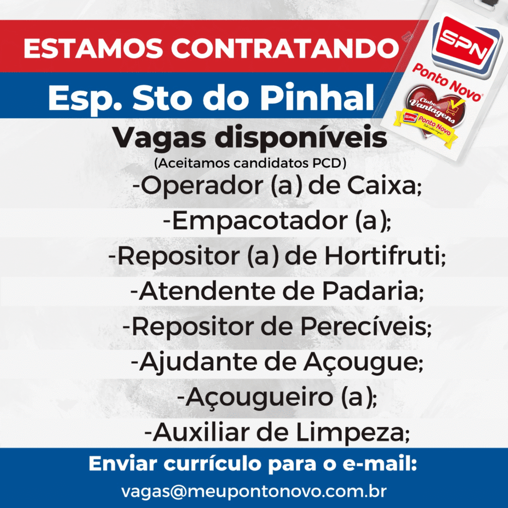 O Supermercado Ponto Novo está com vagas de emprego abertas para reforçar sua equipe em Espírito Santo do Pinhal (SP). A empresa está em busca de novos talentos para diferentes setores da loja e convida candidatos de perfis diversos — incluindo pessoas com deficiência (PCD) e maiores de 50 anos — a se candidatarem.