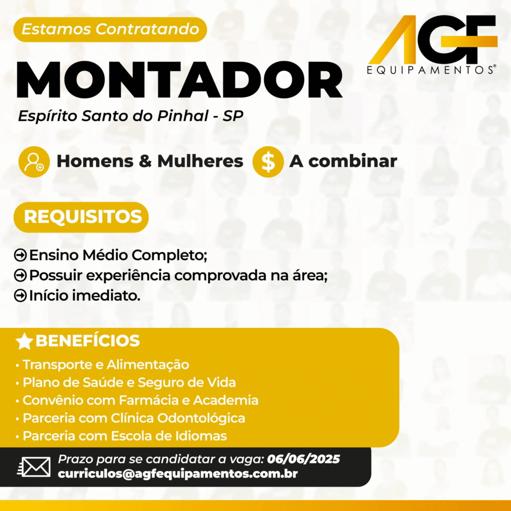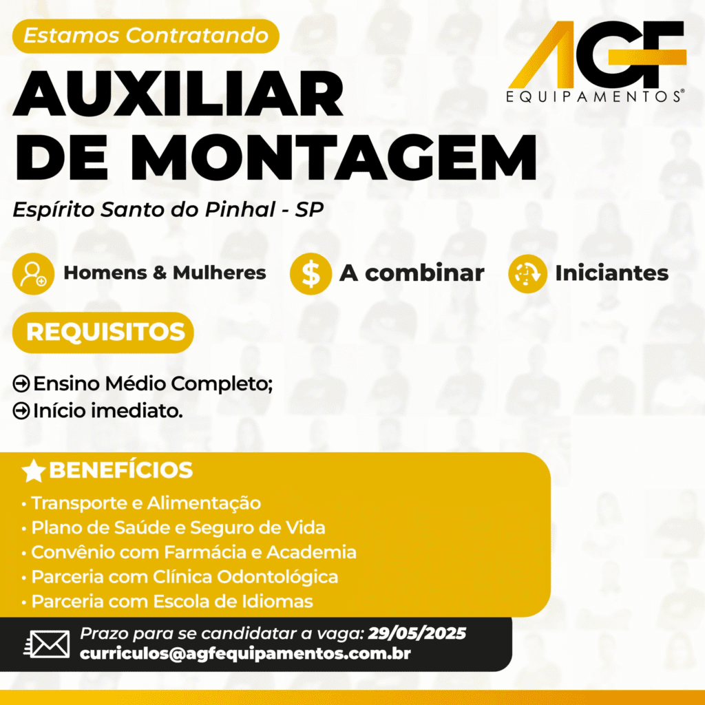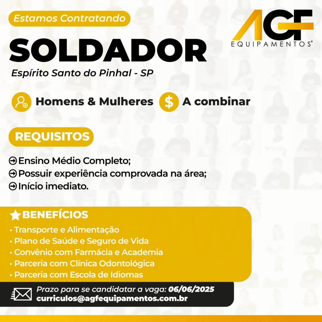 A empresa AGF Equipamentos, localizada em Espírito Santo do Pinhal (SP), está com vagas abertas para os cargos de Soldador, Montador e Auxiliar de Montagem. As oportunidades são destinadas a homens e mulheres, com salários a combinar e início imediato. Confira os requisitos no final da matéria.